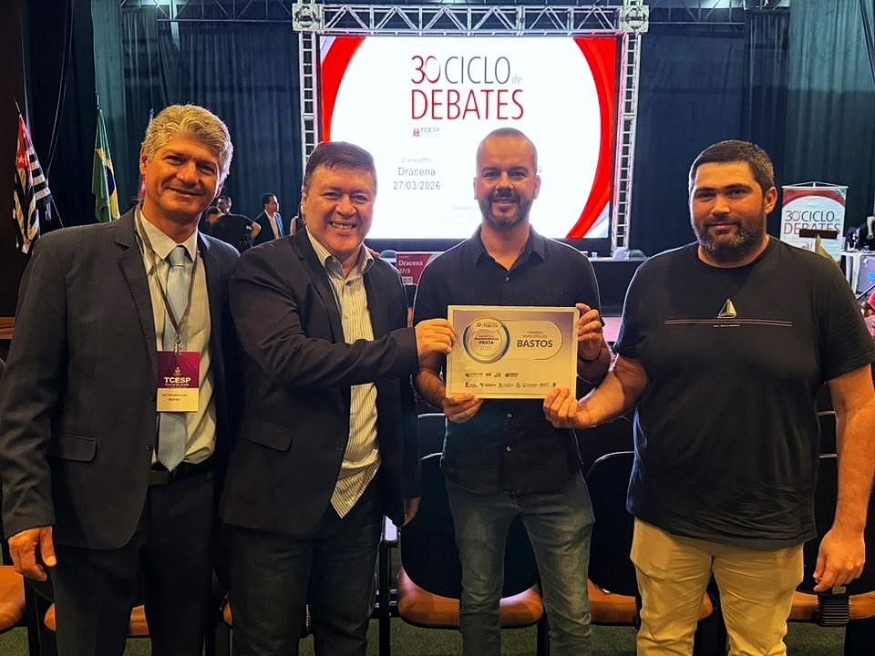 Em uma cerimônia marcada pelo reconhecimento à gestão pública eficiente, a Câmara Municipal de Bastos recebeu oficialmente o Selo Prata de Transparência Pública. A entrega ocorreu nesta sexta-feira, 27 de março de 2026, durante o 30º Ciclo de Debates do Tribunal de Contas do Estado de São Paulo (TCESP), realizado na cidade de Dracena/SP. A honraria foi entregue pessoalmente pela Presidente do Tribunal de Contas de São Paulo, Sra. Cristiana de Castro Moraes, ao Presidente da Câmara, Valter Bataline, destacando o compromisso do legislativo bastense com o Programa Nacional de Transparência Pública (PNTP).